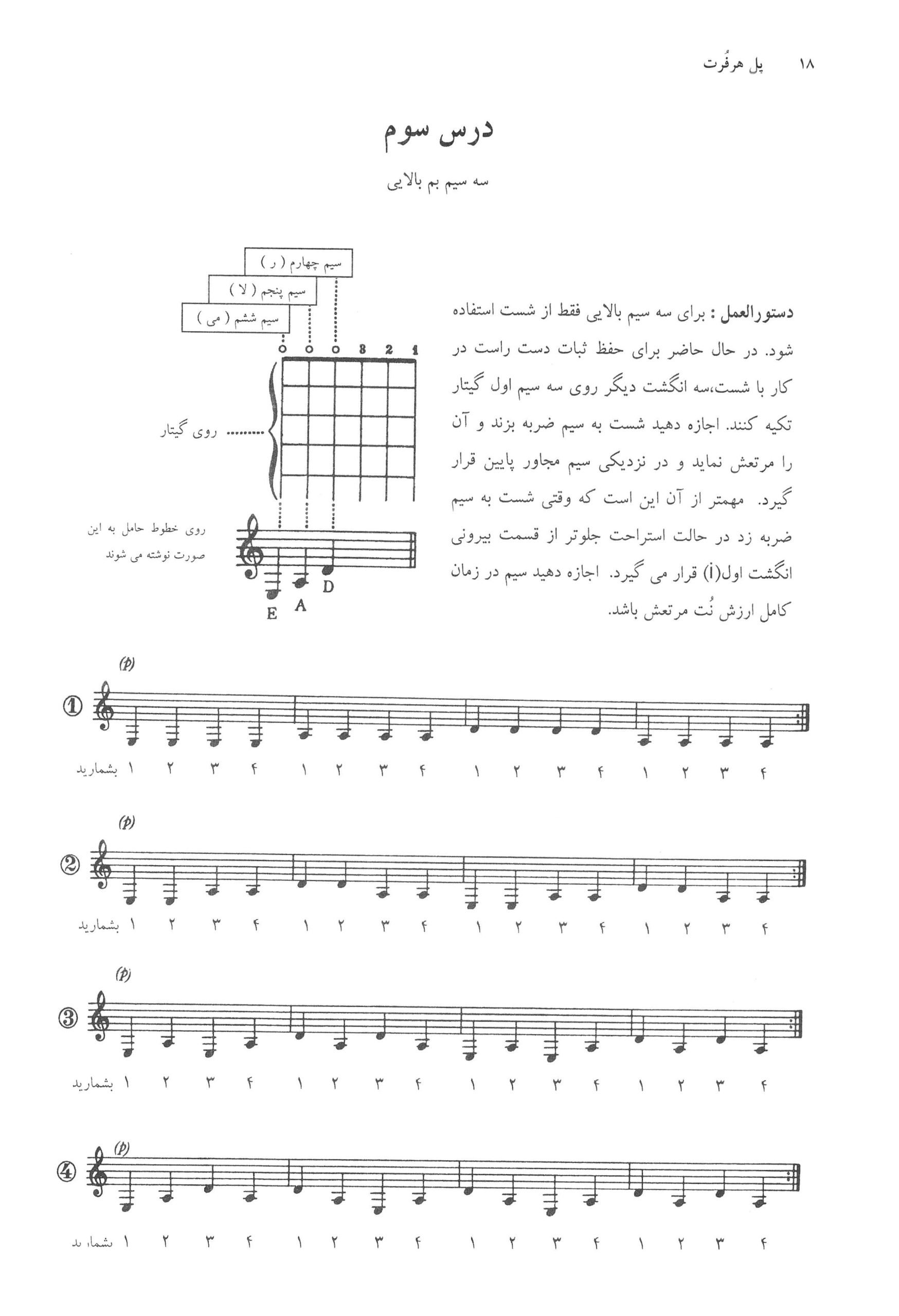 درس سوم تمرین ۱ تا ۴. کتاب آموزش گیتار کلاسیک یک روز یک درس حسین دی پیر اثر پل هر فورت