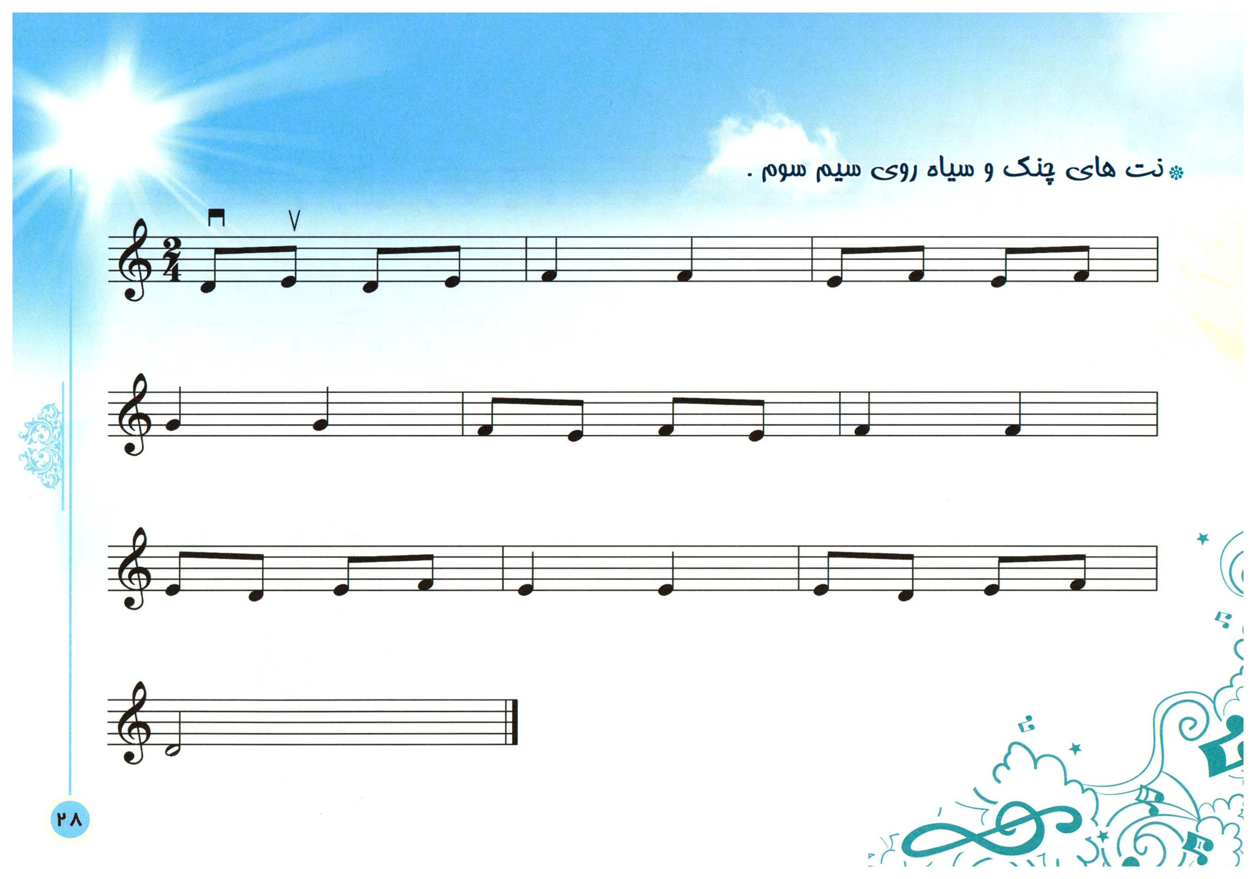 ۲۱. نت چنگ و سیاه روی سیم سوم کتاب آموزش گام به گام ویولن برای کودکان جلد اول ایمان ملکی