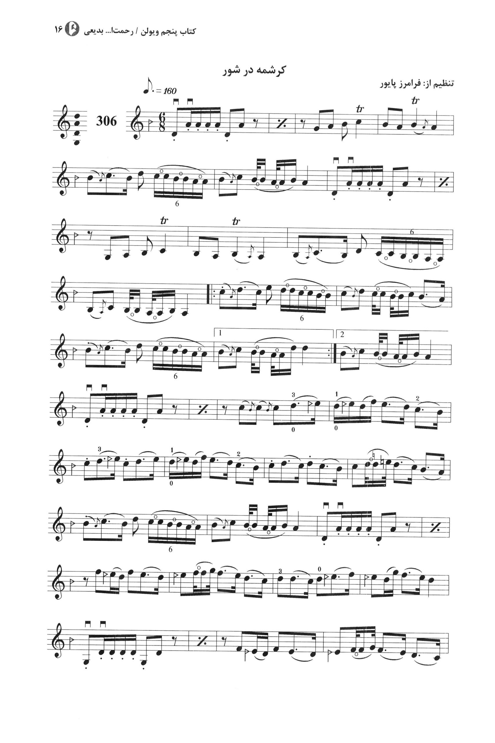 ۳۰۶. کرشمه در شور فرامرز پایور کتاب پنجم و ششم ویولن هنرستان نوشته رحمت الله بدیعی